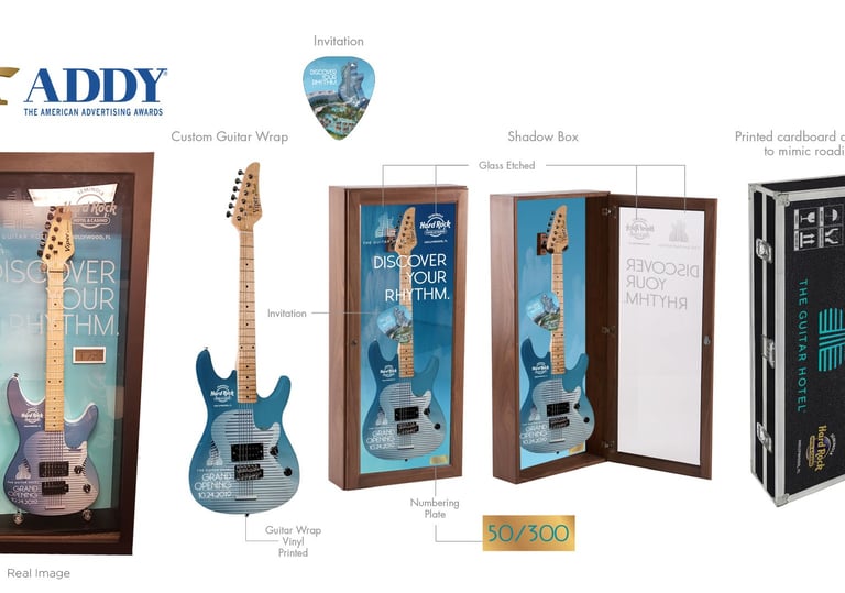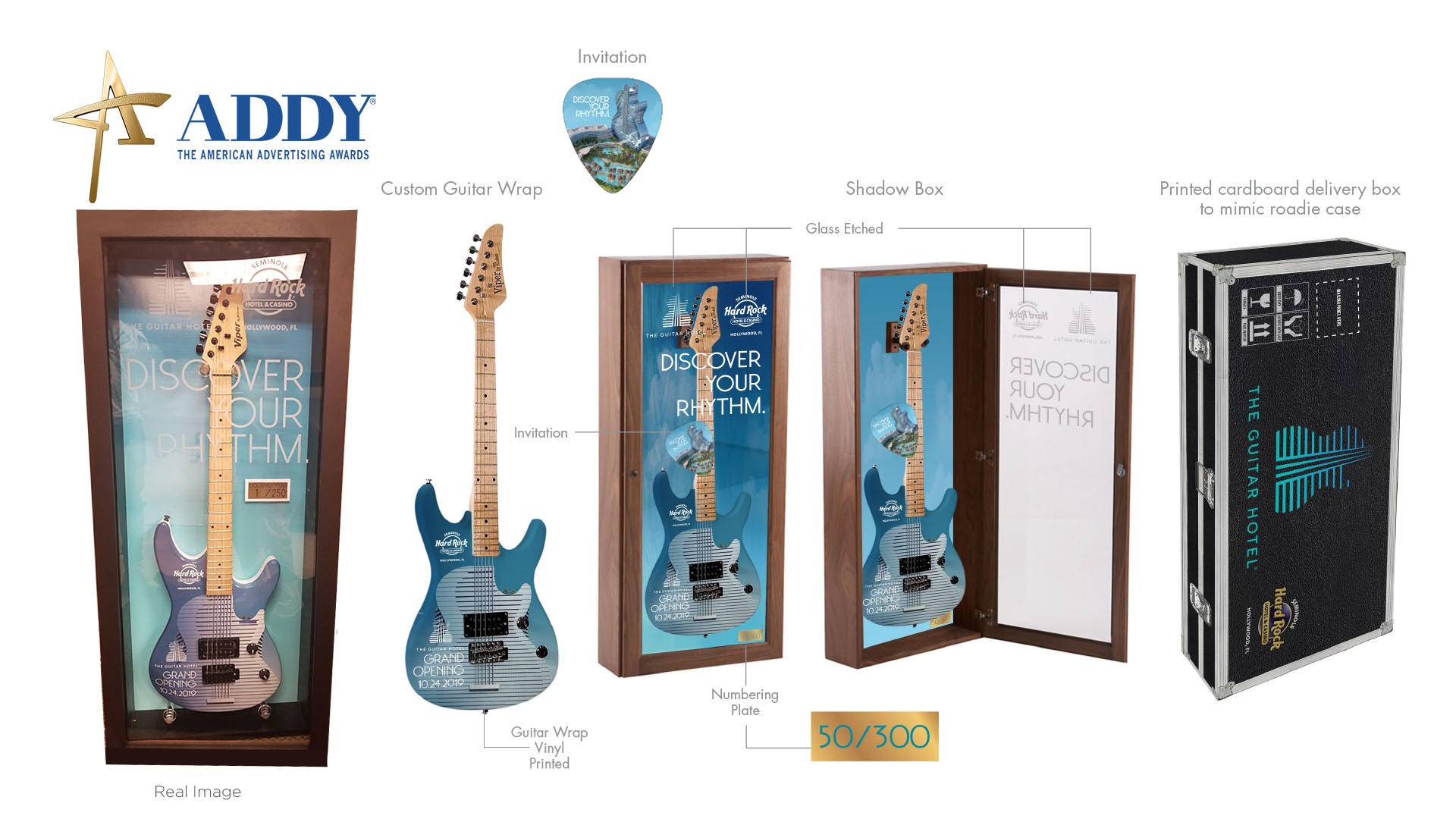 The guitar was encased in a wood and glass shadow box, complete with a numbered edition plate and a printed guitar pick invitation. To complete the experience, the piece was delivered in a cardboard box