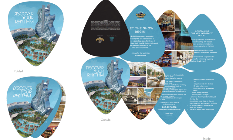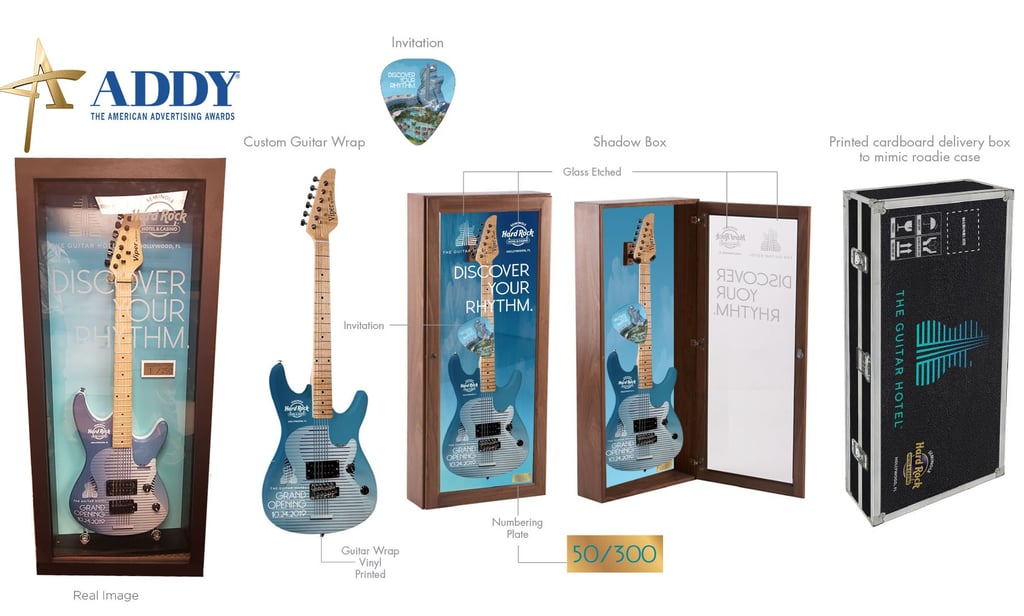 This limited-edition VIP invitation was created for the grand opening of The Guitar Hotel at Seminole Hard Rock Hotel & Casino in Hollywood, Florida. Only 300 invitations were produced, each designed as a custom-wrapped guitar featuring the hotel’s iconic silhouette.
