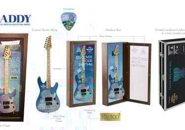 The guitar was encased in a wood and glass shadow box, complete with a numbered edition plate and a printed guitar pick invitation. To complete the experience, the piece was delivered in a cardboard box designed to mimic a roadie case, reinforcing the rock-and-roll essence of the brand.