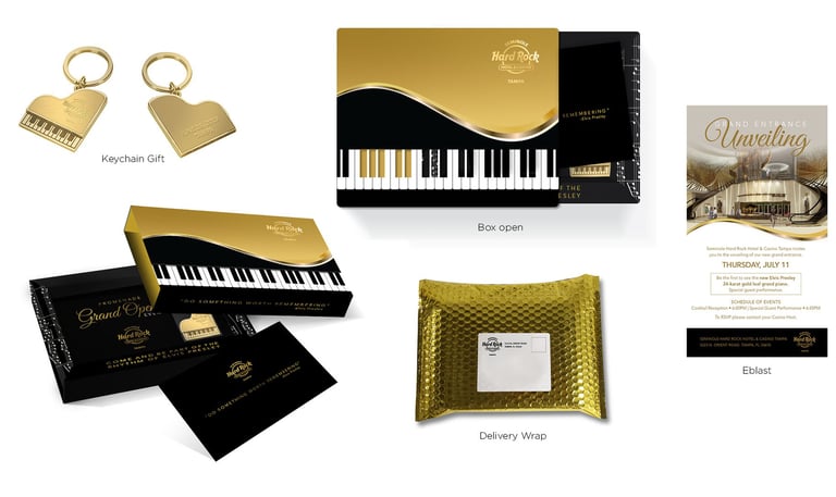 This exclusive invitation was designed for the grand unveiling of Hard Rock Hotel & Casino Tampa’s newly remodeled lobby, featuring a one-of-a-kind piece of rock history: Elvis Presley’s 24-karat gold leaf grand piano. Originally purchased by Elvis in 1955 for his mother, and later gilded by Priscilla Presley in 1968, the piano became the stunning centerpiece of the hotel’s atrium.